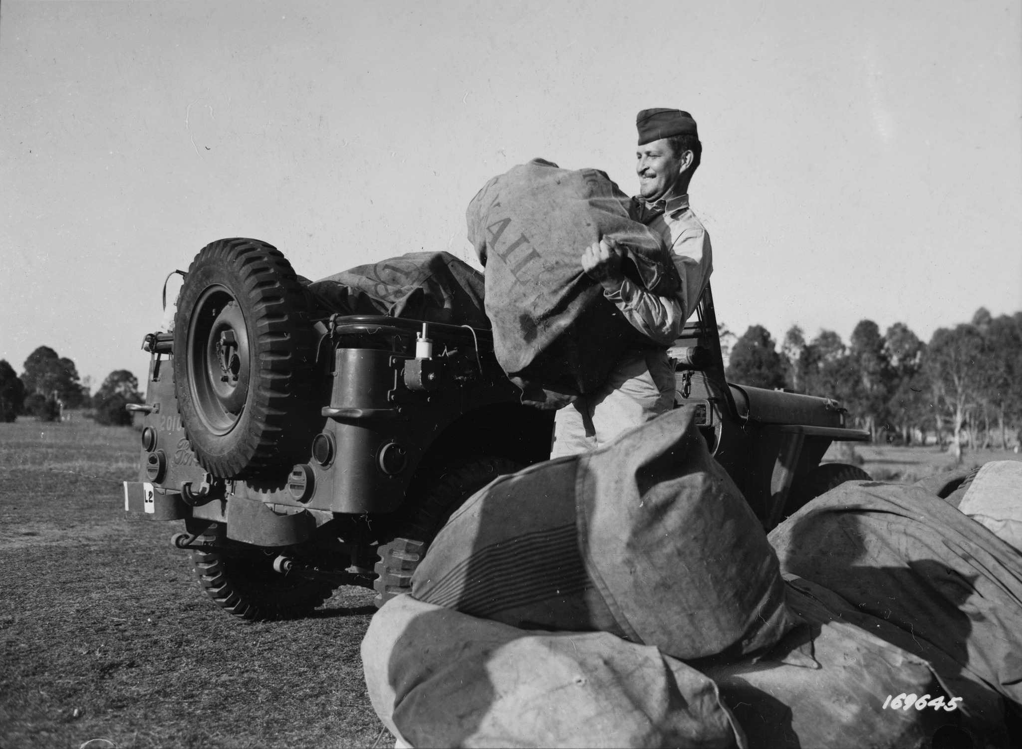 Pfc. Edward Winslow, of the 120th Field Artillery Headquarters Battery, loads a mailbag for distribution to the troops Sept. 10, 1942 at Camp Cable near Brisbane, Australia. U.S. Signal Corps photo