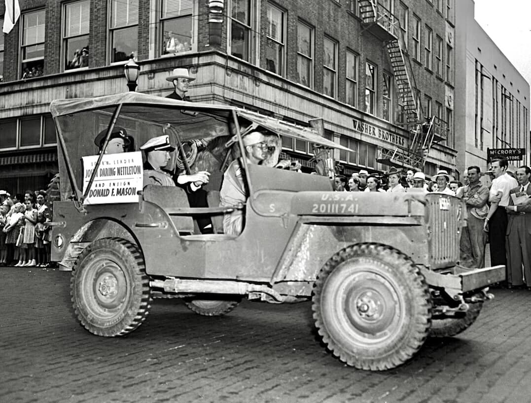 20111741 s GPW Hero Parade. Squadron Leader John Daring Nettleton and Ensign Donald F. Mason, in Jeep. 1942. Forth Worth Star-Telegram Collection